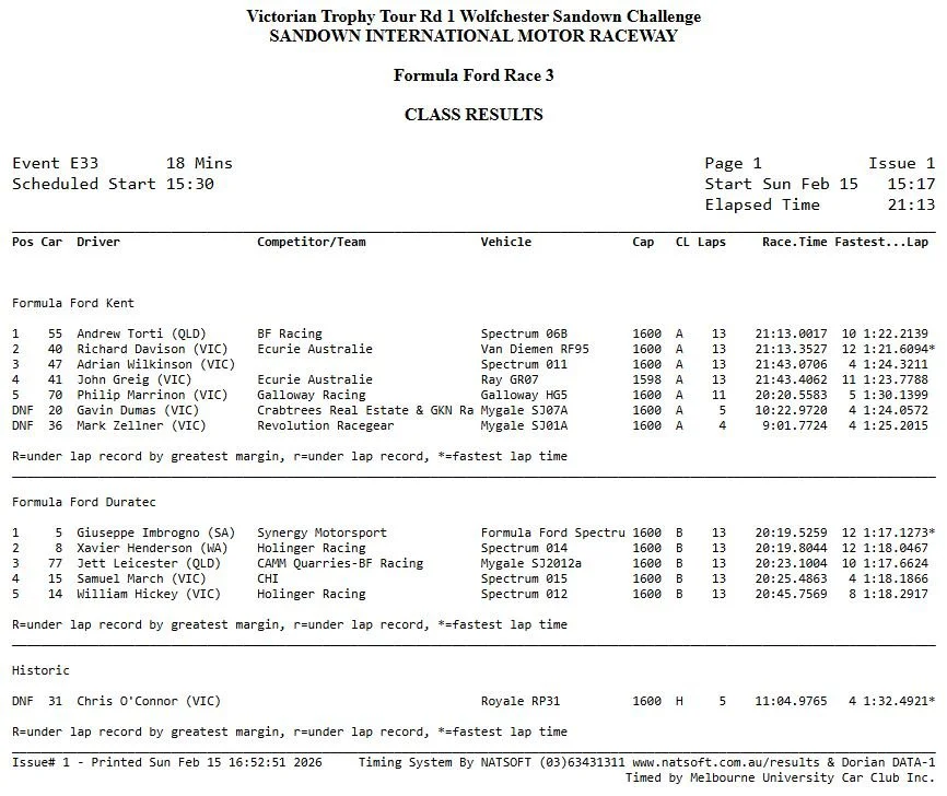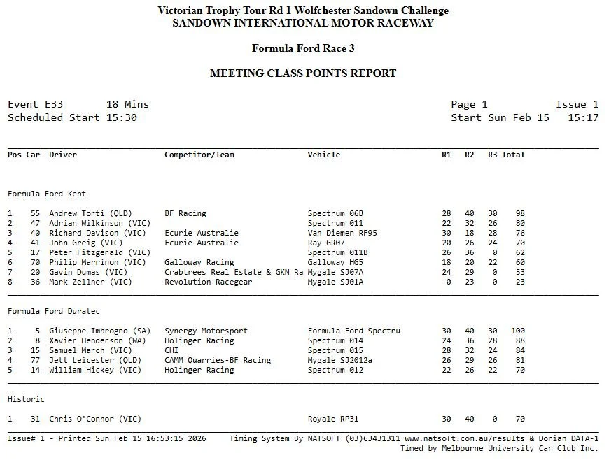 BF Racing South Pacific Marine Group driver Andrew Torti has completed a strong start to his 2026 Formula Ford campaign with 2 race wins and a round victory at Round 1 of the Victorian State Formula Ford 1600 championships, at Sandown Motor Raceway in Melbourne.