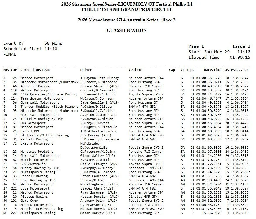 BF Racing South Pacific Marine Group driver Andrew Torti has claimed a strong 2nd place podium on debut, during Round 1 of the 2026 Monchrome GT4 Championship at the Phillip Island Grand Prix circuit.
